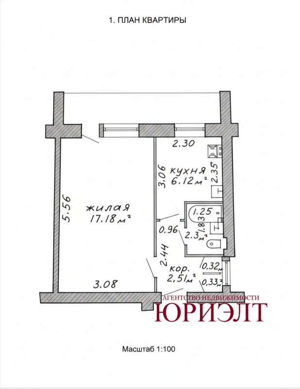 Общая площадь — 30.2 м2. Просторная жилая комната — 17.18 м2.