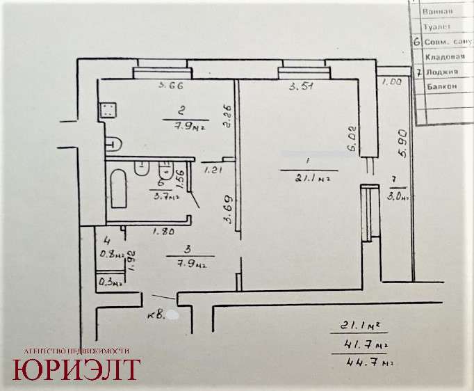 Общая площадь 44,7 м2.Просторная комната 21,1 м2.,с огромной лоджией.Кухня 7,9 м2 и коридор 7,9 м2.