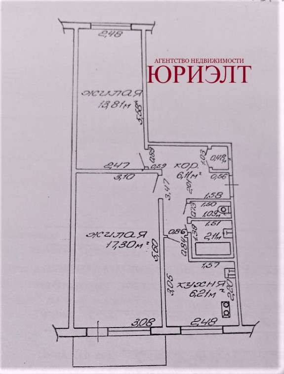 Общая площадь 47 м2.Комната 17 и 14 м2.