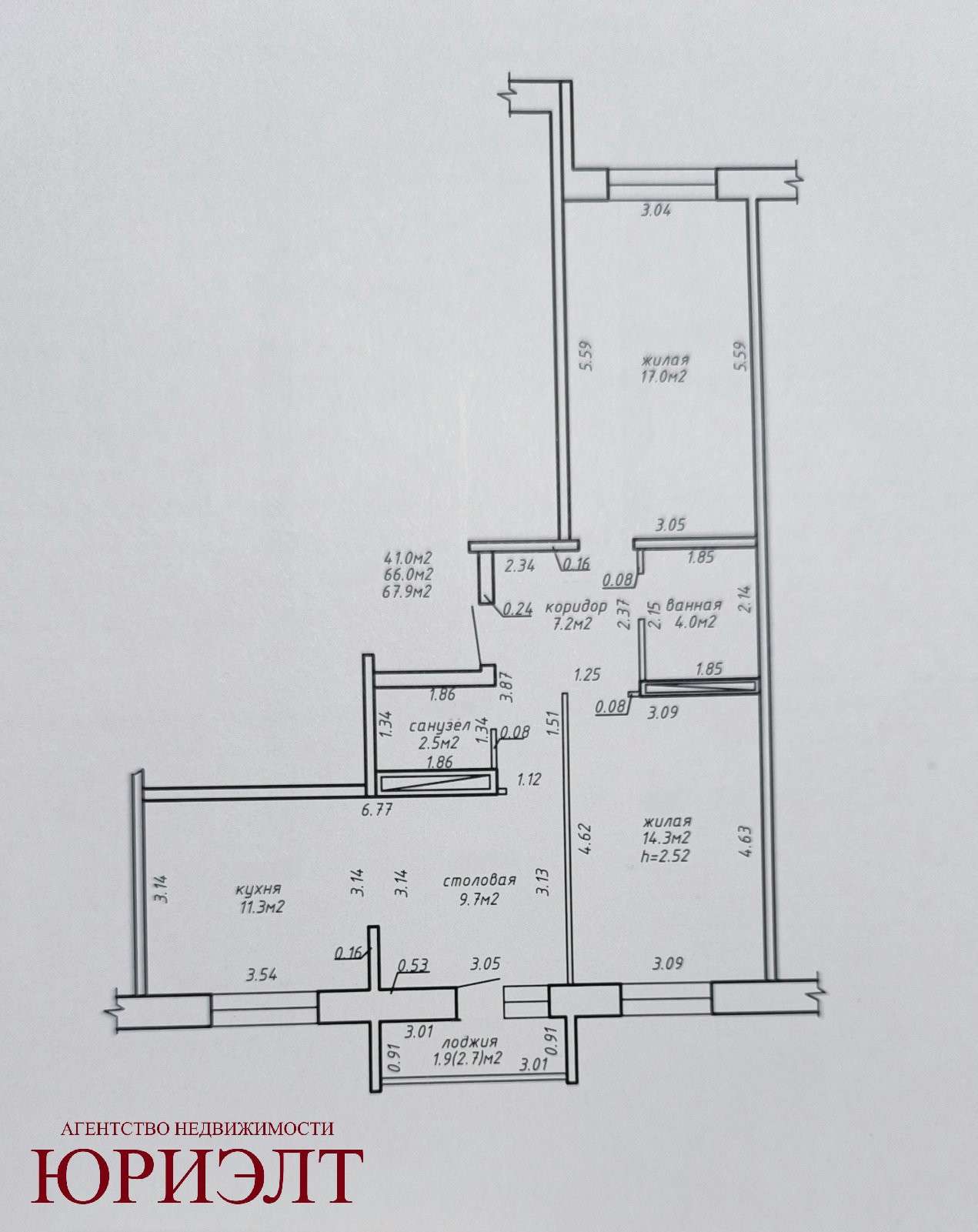 Общая площадь 66 м2, жилая 41 м2, кухня 11,3 м2. Комнаты большие , просторные - 17 м2 и 14,3 м2. Столовая с выходом на лоджию.